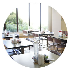 道産米の使用だけではなく、食材も地産地消をベースに展開している。和洋の日替わり定食の他、多忙な職員のニーズに合わせて弁当タイプにした日替わり弁当も人気の一つになっている。テーブルの数も15テーブルと1度に60名収容可能。